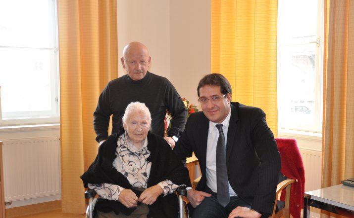 Seniorin heute – ein Jahrhundert später – in Innsbruck ihren Geburtstag feiert. Anlässlich dieses runden Feiertages stattete ihr Vizebürgermeister Franz X. Gruber im Wohnheim Saggen einen Besuch ab und gratulierte mit einem Strauß Blumen.