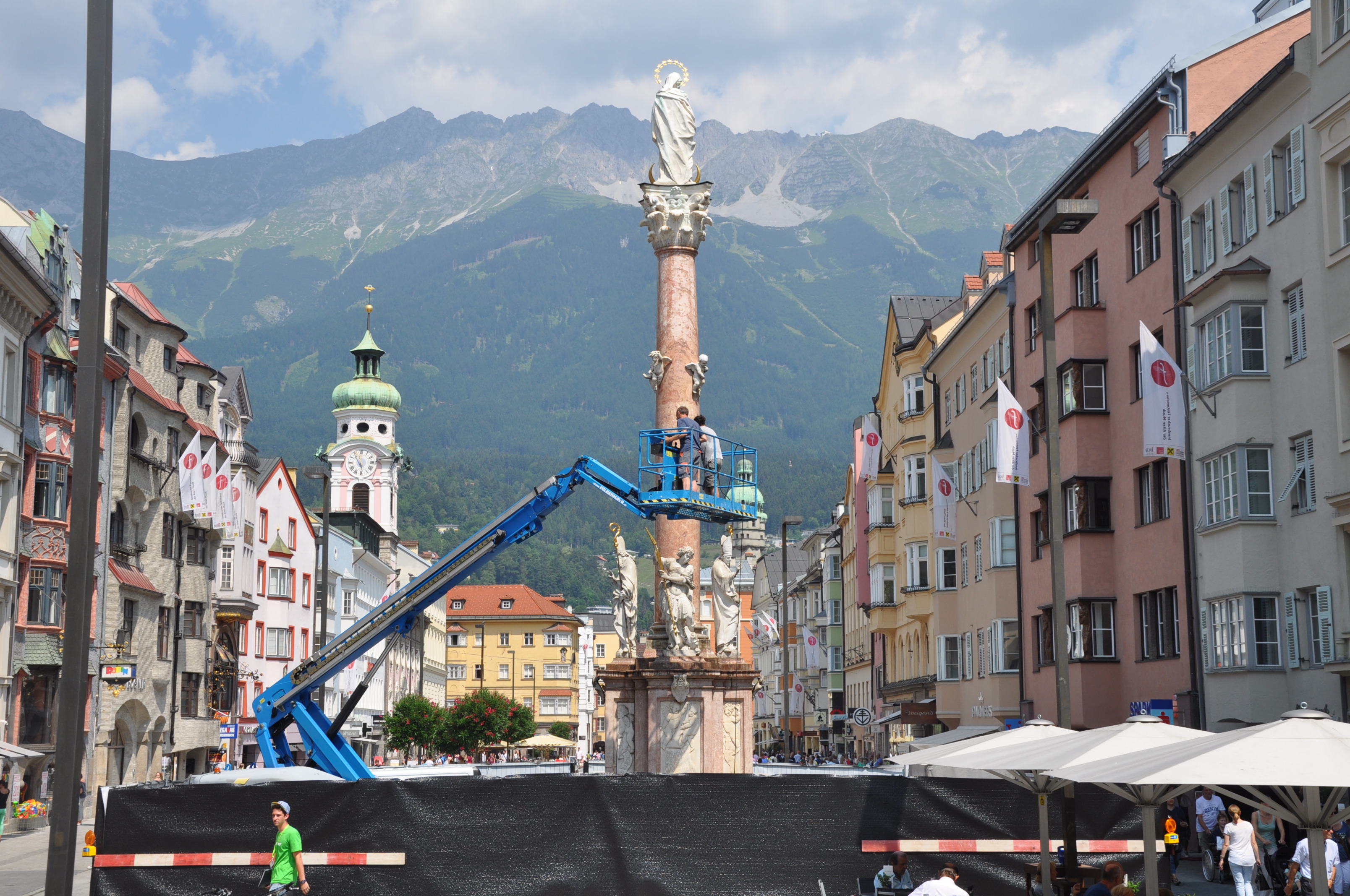 Die Innsbrucker Annasäule ist ein beliebter Ort zum Verweilen – sowohl für InnsbruckerInnen als auch für Gäste. Auch als Fotomotiv schafft es das Bauwerk in die Fotoalben weltweit. „Damit dies auch in Zukunft so sein kann, sind Reinigungsarbeiten notwendig. Danach wird die gern fotografierte Säule wieder in neuem Glanz erscheinen“, erklärt Vizebürgermeister Christoph Kaufmann.