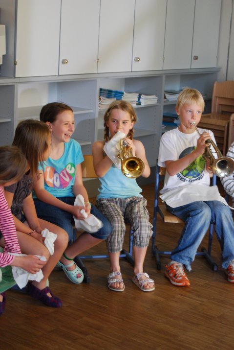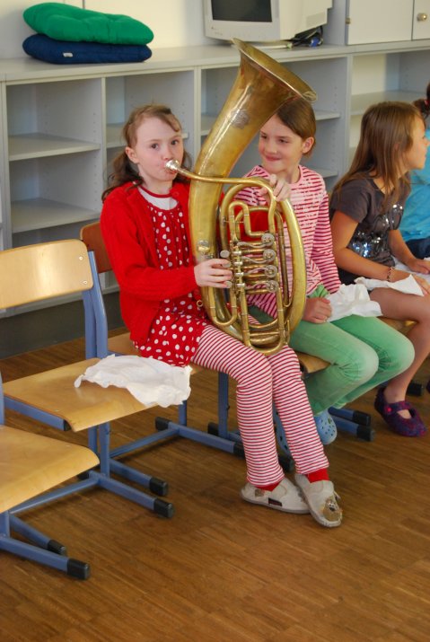 In zwei Räumen der Volksschule Pradl Leitgeb I durften die Kinder Erfahrungen mit Blech- und Holzblasinstrumenten sowie Streich- und Schlagwerkinstrumenten sammeln. Dabei standen ihnen die beiden Workshopleiterinnen Kristin Balassa und Nicole Thaler zur Seite.