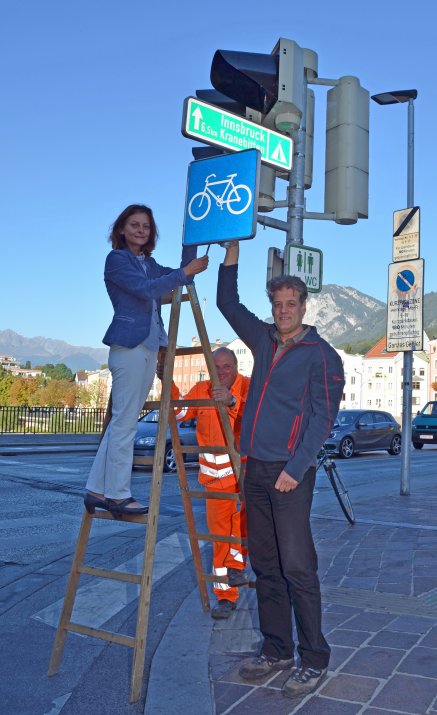 Auf der Innbrücke wurde dies bereits in die Tat umgesetzt. Am 25. September informierten Vizebürgermeisterin Mag.ª Sonja Pitscheider, Radkoordinator Helmut Krainer und Ing. Herbert Schwarz (Amt für Tiefbau) über die neue Regelung und montierten das entsprechende Verkehrsschild.