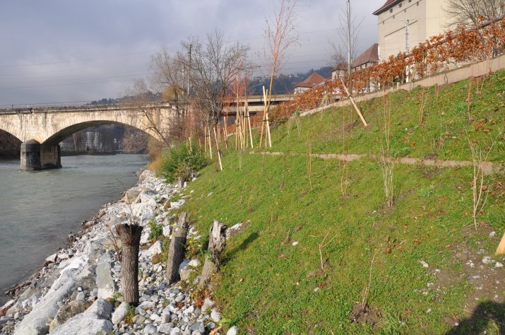 Die östlich der ÖBB-Mühlauer-Brücke gelegene Baustelle umfasste eine Länge von rund 100 Metern. An der Uferböschung und entlang des Grünstreifens zwischen Promenadenweg und Hallerstraße wurden nun insgesamt rund 440 Quadratmeter Grünfläche wiederhergestellt. Gefällte Bäume wurden neu gesetzt, zusätzlich wurden allein in der Uferböschung 22 neue Bäume und 240 Stück Sträucher eingepflanzt.