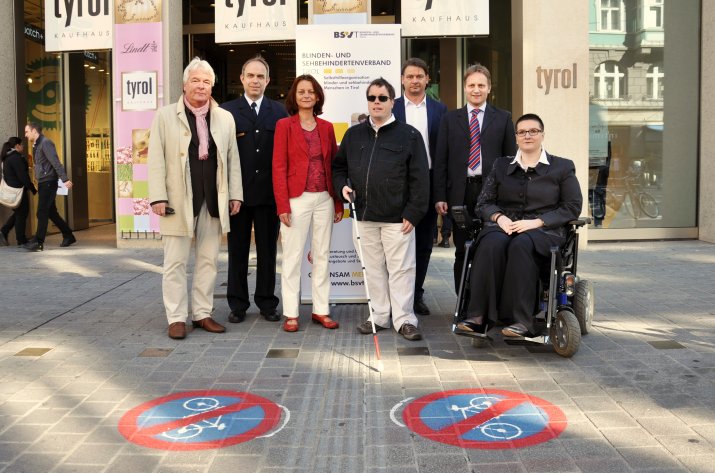 „Die taktilen Leitsysteme wurden in den vergangenen Jahren konsequent in ganz Innsbruck ausgebaut, da sie die Orientierung für Blinde und Sehbehinderte erheblich erleichtern“, erklärte die für Tiefbau und Mobilität zuständige Vizebürgermeisterin Mag.a Sonja Pitscheider anlässlich eines Pressegesprächs am 23. April. „Hier in der Maria-Theresien-Straße blockieren allerdings häufig zahlreiche Fahrräder, Verkaufsständer und Autos die Linien. Das erschwert nicht nur die Orientierung, sondern birgt auch ein hohes Verletzungsrisiko. Die neuen Bodenmarkierungen sollen helfen, die Aufmerksamkeit der BürgerInnen verstärkt auf die Linien zu lenken und die Leitsysteme frei zu halten.“ Hier sei besonders auf ein Miteinander im Straßenverkehr und auf die Bedürfnisse der Blinden und Sehbehinderten zu achten, so Pitscheider weiter.