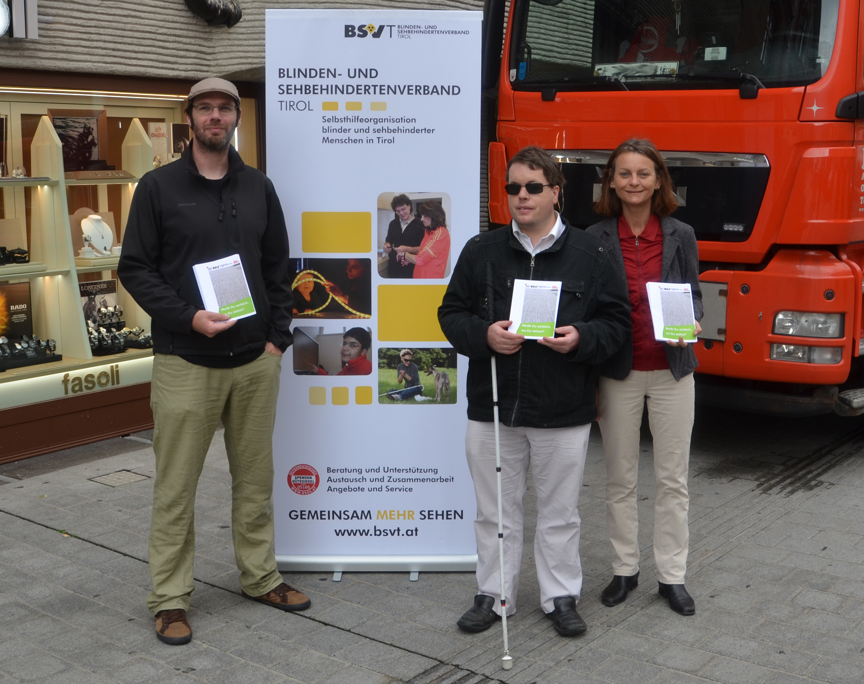 Besonders am Vormittag, wenn Ladetätigkeiten vorgenommen werden, wird das Blindenleitsystem, das beispielsweise am Boden der Maria-Theresien-Straße verläuft, häufig durch Hindernisse unterbrochen. Lieferwägen oder Container werden gedankenlos auf dem System geparkt und somit zur direkten Gefahr für Menschen mit Sehbeeinträchtigung. Vizebürgermeisterin Mag.a Sonja Pitscheider verwies gemeinsam mit Mag. Wolfgang Grünzweig (Behindertenkoordinator der Stadt Innsbruck), der in Vertretung des zuständigen Stadtrats Ernst Pechlaner erschien, und Michael Berger (Verkehrsreferent des Blinden- und Sehbehindertenverbands Tirol, BSVT) auf die Problematik. Dabei wurde ein neuer Folder verteilt, der die Missstände aufzeigt und zu erhöhter Rücksichtnahme aufruft.
