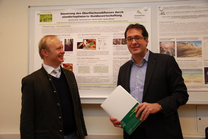 Am 7. Februar besuchte Vizebürgermeister Franz Xaver Gruber das Institut für Naturgefahren und alpine Wanderregionen des Bundes-Forschungs- und Ausbildungszentrums (BFW). Bei einem Rundgang durch das Haus und einer Vorstellung des Instituts mit einer Präsentation der Abteilungen „Schnee und Lawinen“, „Wildbach und Erosion“, „Gebietswasserhaushalt und Alpine Waldregionen“ erläuterte Institutsleiter Dr. Karl Kleemayr die Dringlichkeit des Forschungsprojektes EROSTAB, wobei er auch auf das Erfordernis einer Mitfinanzierung durch die Stadt Innsbruck hinwies.