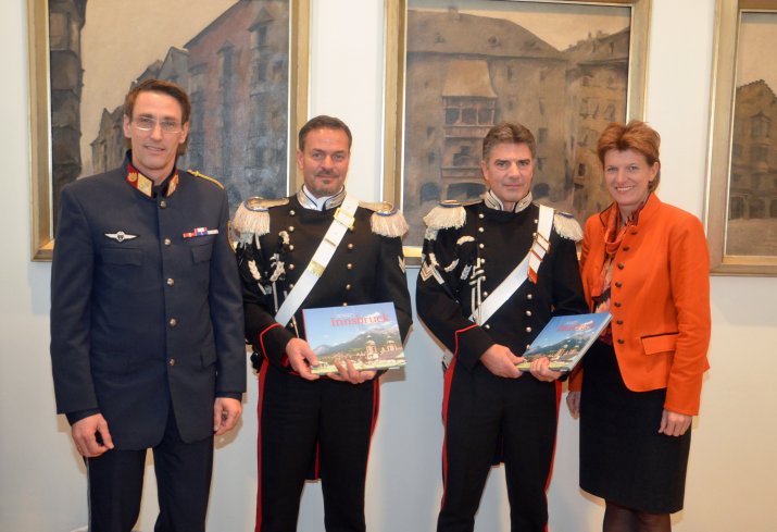 Am 4. Dezember besuchten die beiden Beamten gemeinsam mit ihren Tiroler KollegInnen Bürgermeisterin Mag.a Christine Oppitz-Plörer im Rathaus. „Ich freue mich, dass das Polizeikommando Tirol auch heuer wieder diese tolle Aktion initiiert hat“, begrüßte die Bürgermeisterin die Polizeibeamten aus Südtirol: „Unsere italienischen Gäste sind in Innsbruck herzlich willkommen. Diese Aktion sehe ich als Bereicherung für die Tourismusstadt Innsbruck.“