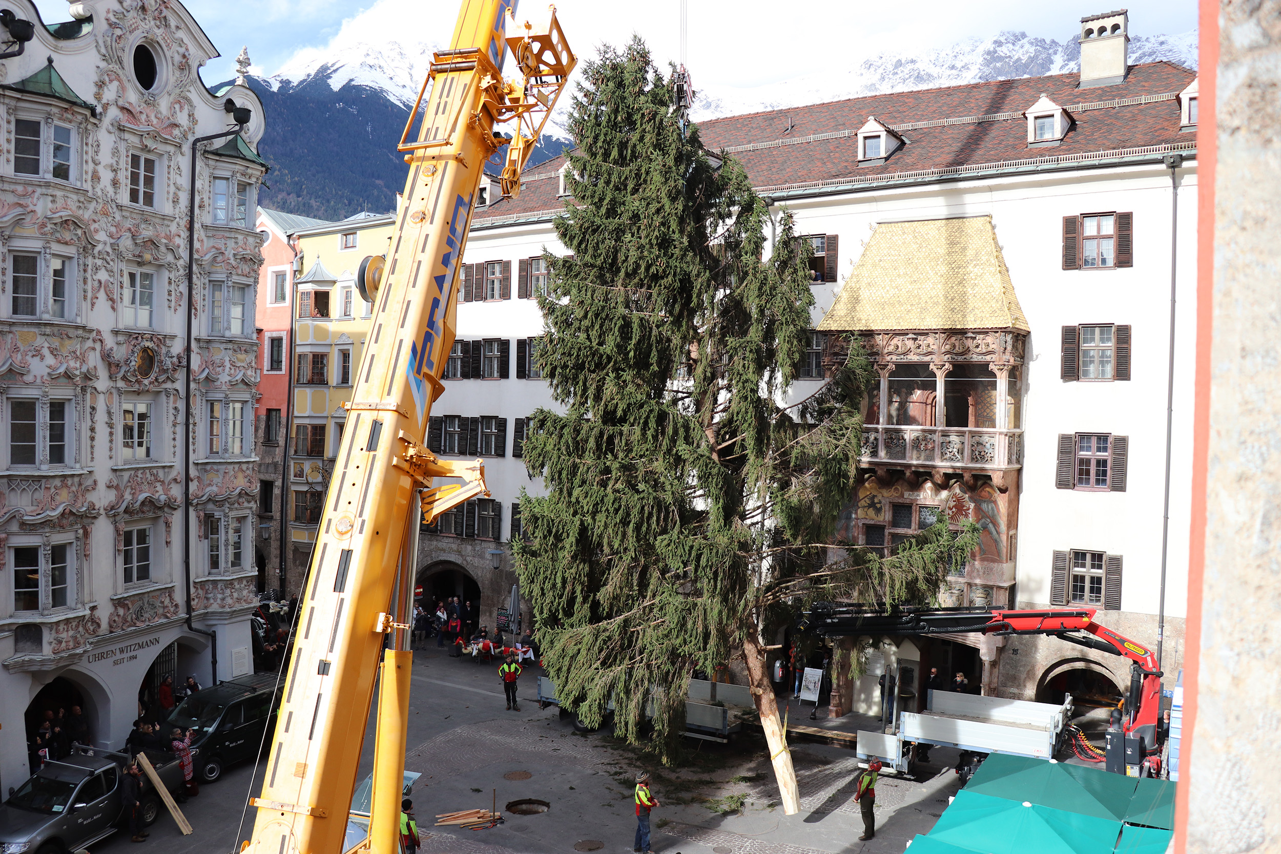 Bereits seit 1934 steht er symbolisch für die Vorfreude auf das Weihnachtsfest in der Innsbrucker Altstadt: der städtische Christbaum vor dem Goldenen Dachl. Auch heuer thront er wieder im Zentrum des Christkindlmarkts. Gefunden wurde der Weihnachtsbote – eine imposante Fichte – in einem Schrebergarten im Süden Pradls vom Amt für Wald und Natur. Für die sichere Aufstellung sorgten zehn Mitarbeiter und ein Kran.