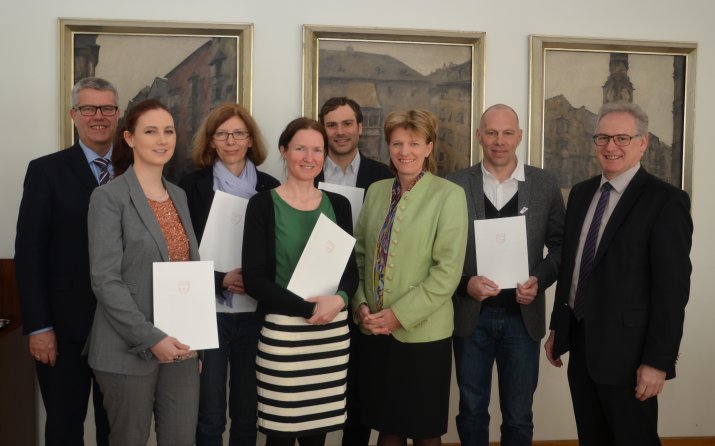 Zur formellen Dekretverleihung lud Innsbrucks Bürgermeisterin Mag.a Christine Oppitz-Plörer gemeinsam mit Magistratsdirektor Dr. Bernhard Holas und Personalchef Mag. Ferdinand Neu am 27. März DI Daniel Schaffenrath, Mag.a Doris Stefanon, Mag.a Miriam Sulaiman, MA, Thomas Waimann und Dr.in Martina Zabernig in ihr Büro im Innsbrucker Rathaus.