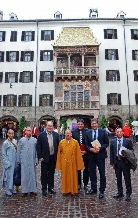 (RMS) Er ist das geistliche Oberhaupt von über 300 Millionen Zen-Buddhisten – und der oberste Abt des weltweiten buddhistischen Shaolin-Ordens. Zwischen einem Besuch bei US-Außenministerin Hillary Clinton und der bevorstehenden Reise nach Moskau zu Ministerpräsident Wladimir Putin, besuchte Abt Shi Yongxin gestern Innsbruck. Vizebgm. Franz X. Gruber begrüßte Seine Heiligkeit gemeinsam mit GR Martin Krulis im Restaurant „Goldener Adler“, wo sich die Gäste-Delegation, der auch Dr. Ding Ding (Koordinator des Abtes für Shaolin-Angelegenheiten in Europa) angehörte, für die Stadtführung mit rein vegetarischer Kost stärken konnte.