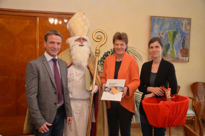 Bereits traditionell, zum Auftakt der jährlichen Adventsammlung der Aktion „Bruder und Schwester in Not“, besucht der Heilige Nikolaus Persönlichkeiten aus Politik, Kirche und Wirtschaft. Am 6. Dezember überbrachte der Nikolaus Bürgermeisterin Mag.a Christine Oppitz-Plörer im Rathaus ein Päckchen mit Pflanzensamen und fair gehandelter Schokolade.