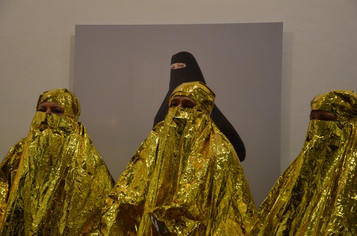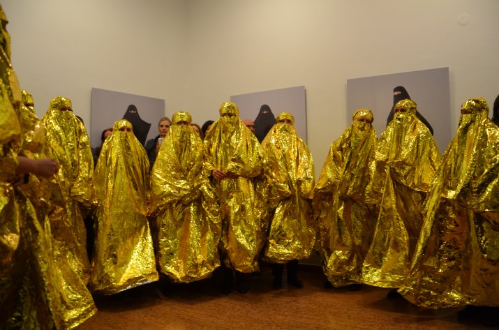 Bei der Vernissage wurde die Galerie im Andechshof außerdem zur Bühne: Im Rahmen einer Performance trugen „Burka-Trägerinnen“ ein Heimatlied vor.