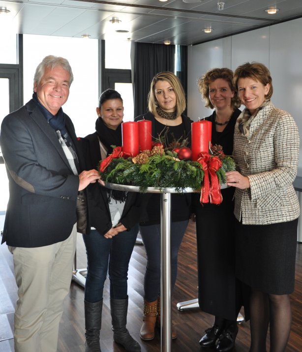 „Advent, Advent ein Lichtlein brennt…“ – Bereits zum vierten Mal spendierte die Firma Bellaflora einen Adventkranz für das städtische Amt für Jugendwohlfahrt. Am 27. November begrüßte Bürgermeisterin Mag.a Christine Oppitz-Plörer gemeinsam mit Sozialstadtrat Ernst Pechlaner die Floristinnen Anka Vukoja und Stefanie Köstlinger, die der Leiterin des Amtes, Mag.a Gabriele Herlitschka, einen Adventkranz im „Tiroler Stil“ übergaben.