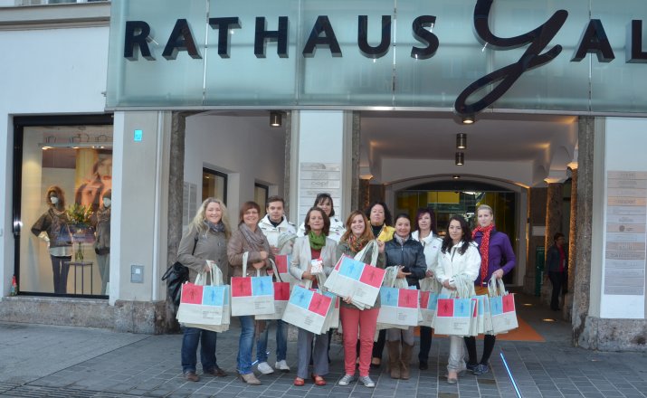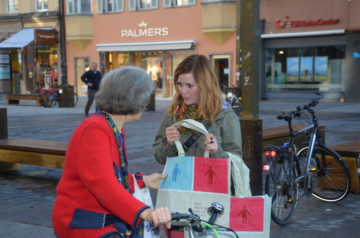 Anlässlich des Equal Pay Days fand auch heuer wieder eine Aktion in der Maria-Theresien-Straße statt: Frauenreferentin Vizebürgermeisterin Mag.a Sonja Pitscheider und die Gemeinderätinnen Marcela Duftner, Kathrin Heis, Dr. Renate Krammer-Stark, Elfriede Moser, Sophia Reisecker und Mag.a Uschi Schwarzl verteilten gemeinsam mit Uschi Klee (Referentin Frauen, Familien und Senioren) sowie den städtischen MitarbeiterInnen Slavica Rajic, Daniel Burgstaller und Ivana Andric Taschen mit dem Aufdruck „Wir machen halbe/halbe – Zeit für mich, uns, andere(s)“ an die PassantInnen, um darauf aufmerksam zu machen, dass es auch anders geht.