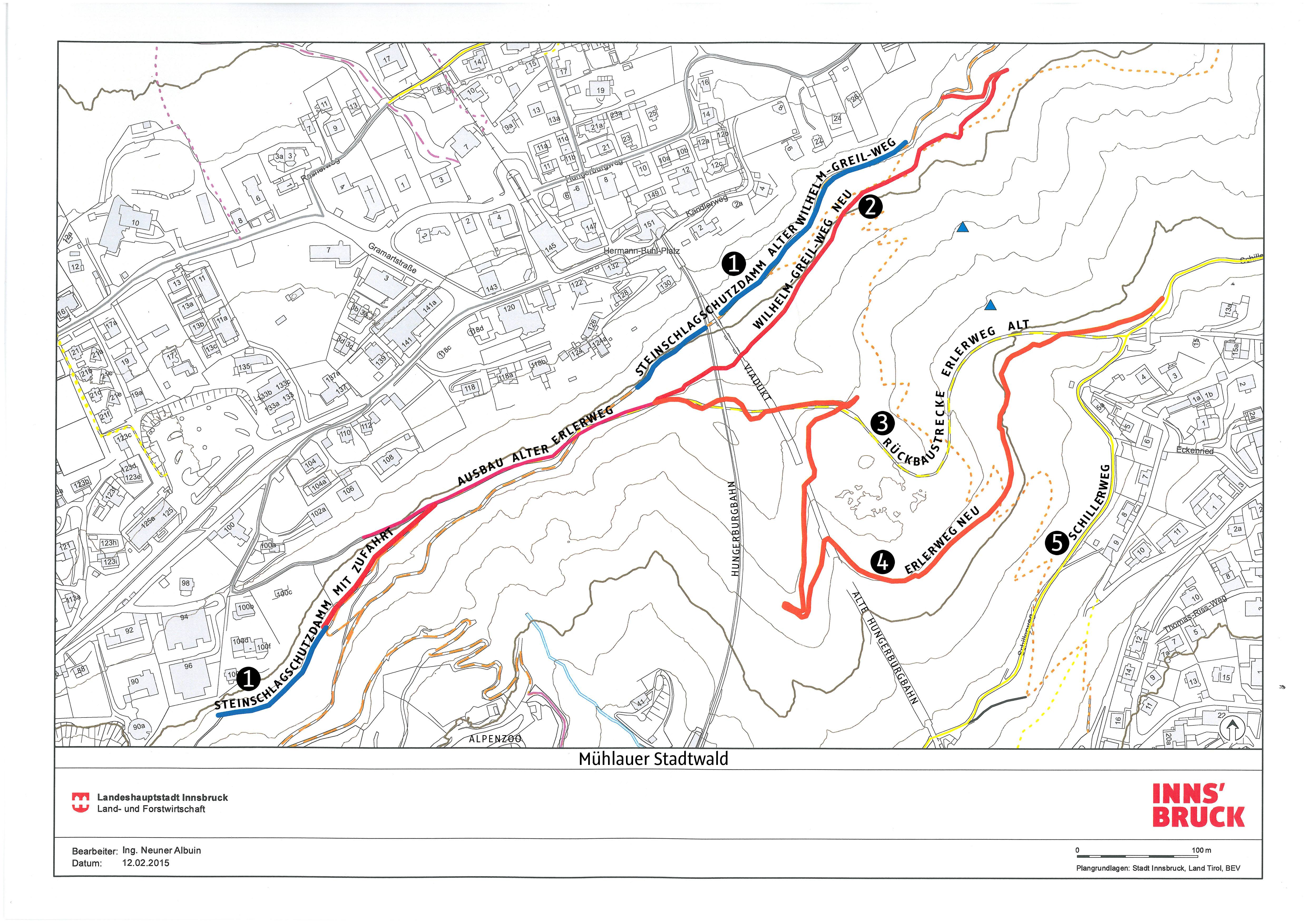 Für den Bau der Steinschlagschutzmaßnahmen des Wilhelm-Greil-Weges bildet der Erlerweg (jetzt Waldweg Hungerburg) die einzige Zufahrtsmöglichkeit. Die vorherige Wegführung und -beschaffenheit [3] ließ die notwendige Nutzung nicht zu. Der nicht adäquate Streckenteil wurde der Natur zurückgegeben und ersatzweise eine neue Streckenführung durch den Mühlauer Stadtwald errichtet. [4]