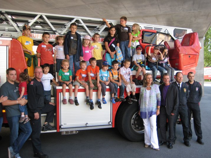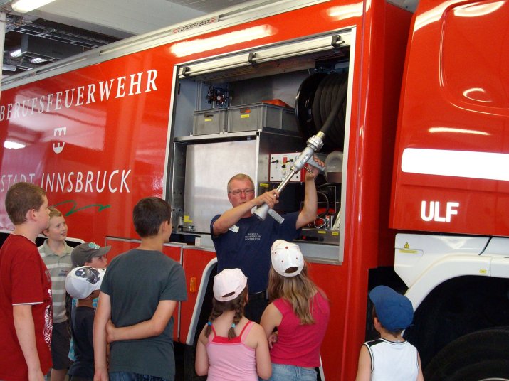 Das Ferienzugprogramm ist vielfältig, die Kinder können sich sportlich, kreativ oder auch als kleine Wissenschaftler betätigen. „Der Besuch von Blaulichtorganisationen ist sehr beliebt“, weiß Birgit Hofbauer vom städtischen Referat für Kinder und Jugendförderung. Daher war natürlich auch der Besuch bei der Berufsfeuerwehr am 10. August sehr gefragt. Feuerwehrmann Bernhard Egger erzählte den Ferienzuggästen anschaulich alles rund um die Feuerwehr und das Verhalten im Notfall. Die Kinder erfuhren dabei, dass die Feuerwehr nicht nur kommt, wenn es brennt, sondern auch bei Autounfällen, Hochwasser, etc. Feuerwehrautos wurden besichtigt und sogar „hineinkraxeln“ war erlaubt. Auch einen echten Alarm erlebten die jungen Gäste und staunten, wie flink die Berufsfeuerwehrmänner mit dem Einsatzfahrzeug davonbrausten. Höhepunkt des zweistündigen Programms waren aber eindeutig die Löschübungen, bei denen es galt, zielgenau zu spritzen und mit einem Feuerlöscher echte Flammen zu bekämpfen.