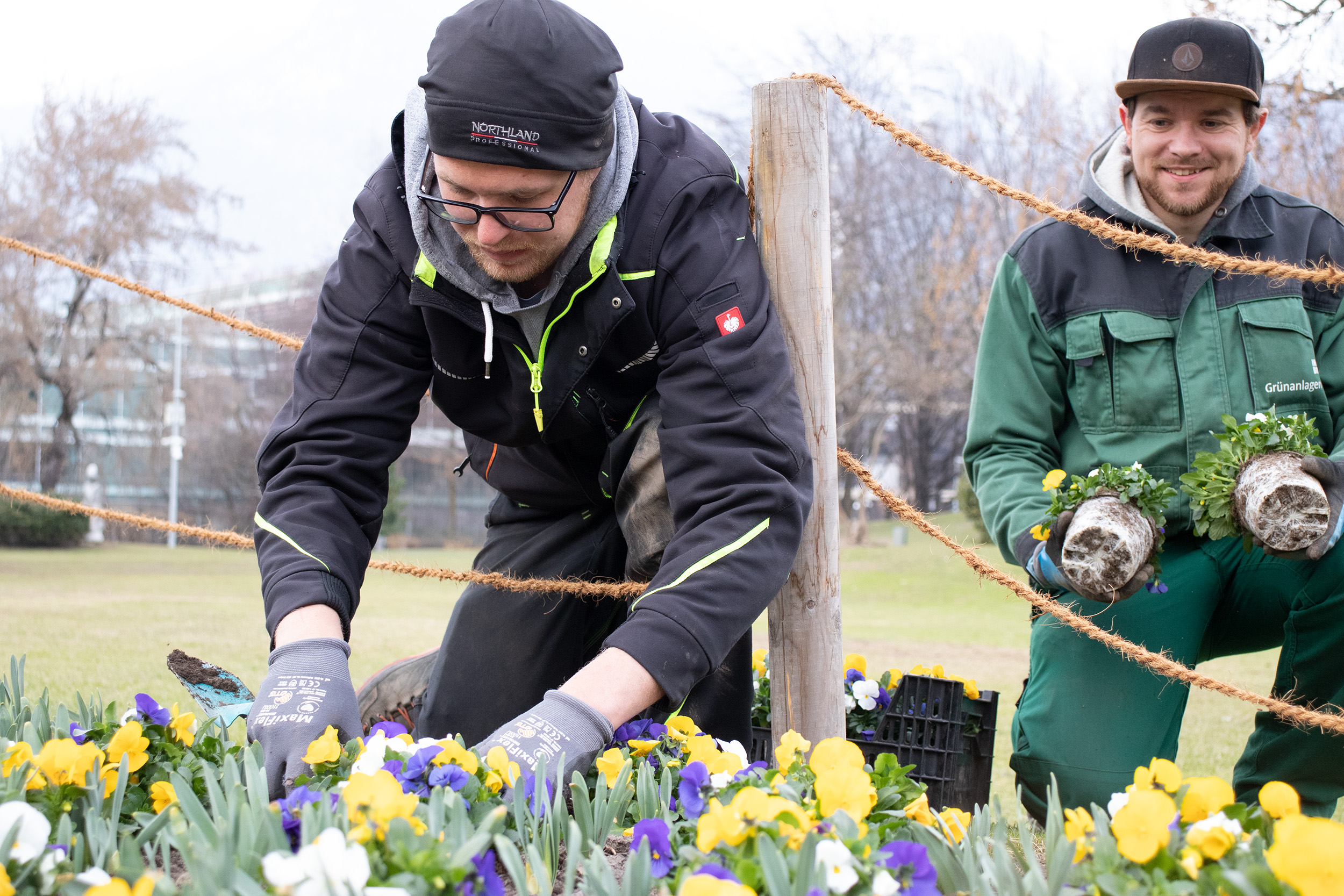 Insgesamt 14 Arbeitspartien der Grünanlagen mit jeweils fünf bis acht MitarbeiterInnen sind im Einsatz, um die zehntausenden Topfblumen einzupflanzen. Die Arbeit dafür beginnt bereits im Herbst des Vorjahres. „Anfang November werden Narzissen- und Tulpenzwiebel in die Beete eingegraben, die im Winter zarte Wurzeln im Boden schlagen und jetzt aus dem Boden sprießen“, schildert Gärtnermeister Michael Gapp vom Amt für Grünanlagen. Zeitgleich werden auch die Jungpflanzen in den Glas- und Folienhäusern in der Stadtgärtnerei in der Rossau eingetopft. „Die Pflanzen werden kalt gezogen, um sie gegen Schädlinge zu schützen und vor größeren Temperaturschwankungen abzuhärten“, klärt der Meistergärtner auf. Die sorgfältige und langsame Aufzucht unter kühlen Bedingungen ist auch einer der wesentlichen Unterschiede zu industriell gezogenen Billigpflanzen, die weniger resistent sind.