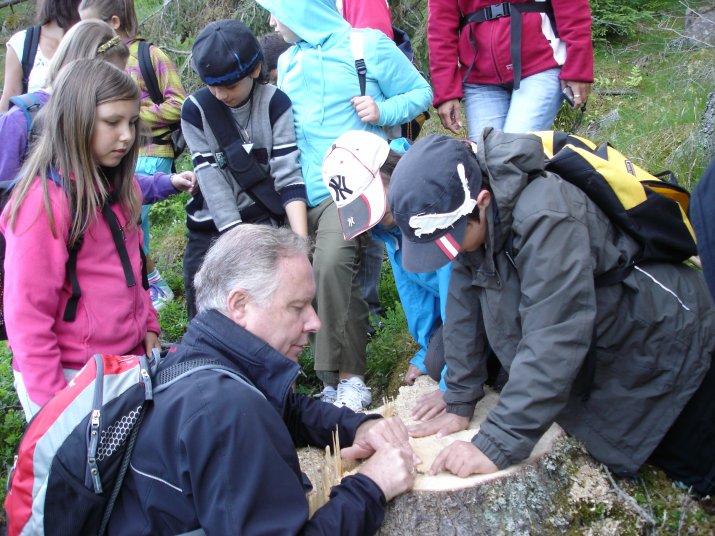 Unter der Begleitung von Hans Zimmermann, Obmann der Agrargemeinschaft Amraser Hochwald, lernten die Kinder neben den Funktionen des Waldes auch den abwechslungsreichen Beruf des Waldaufsehers Georg Kinzner kennen. Die fachgerechte Schlägerung und Aufarbeitung eines Baumes durfte dabei nicht fehlen. Hannes Nagiller, Jäger im Wald der Agrargemeinschaft, erklärte den jungen WaldexpertInnen die interessanten Zusammenhänge zwischen dem Forstgebiet und der heimischen Tierwelt. Die Besichtigung der Schreierbachquellfassung brachte den SchülerInnen außerdem die Trinkwasserversorgung in Innsbruck nahe.