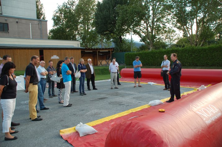 Branddirektor Mag. Erwin Reichel erläuterte zunächst die technischen Möglichkeiten der Feuerwehr Innsbruck bei der Gefahrenabwehr von Hochwasser. Zur eindrucksvollen Demonstration wurden Teile des mobilen Hochwasserschutzes am Hof der Hauptfeuerwache aufgebaut.
