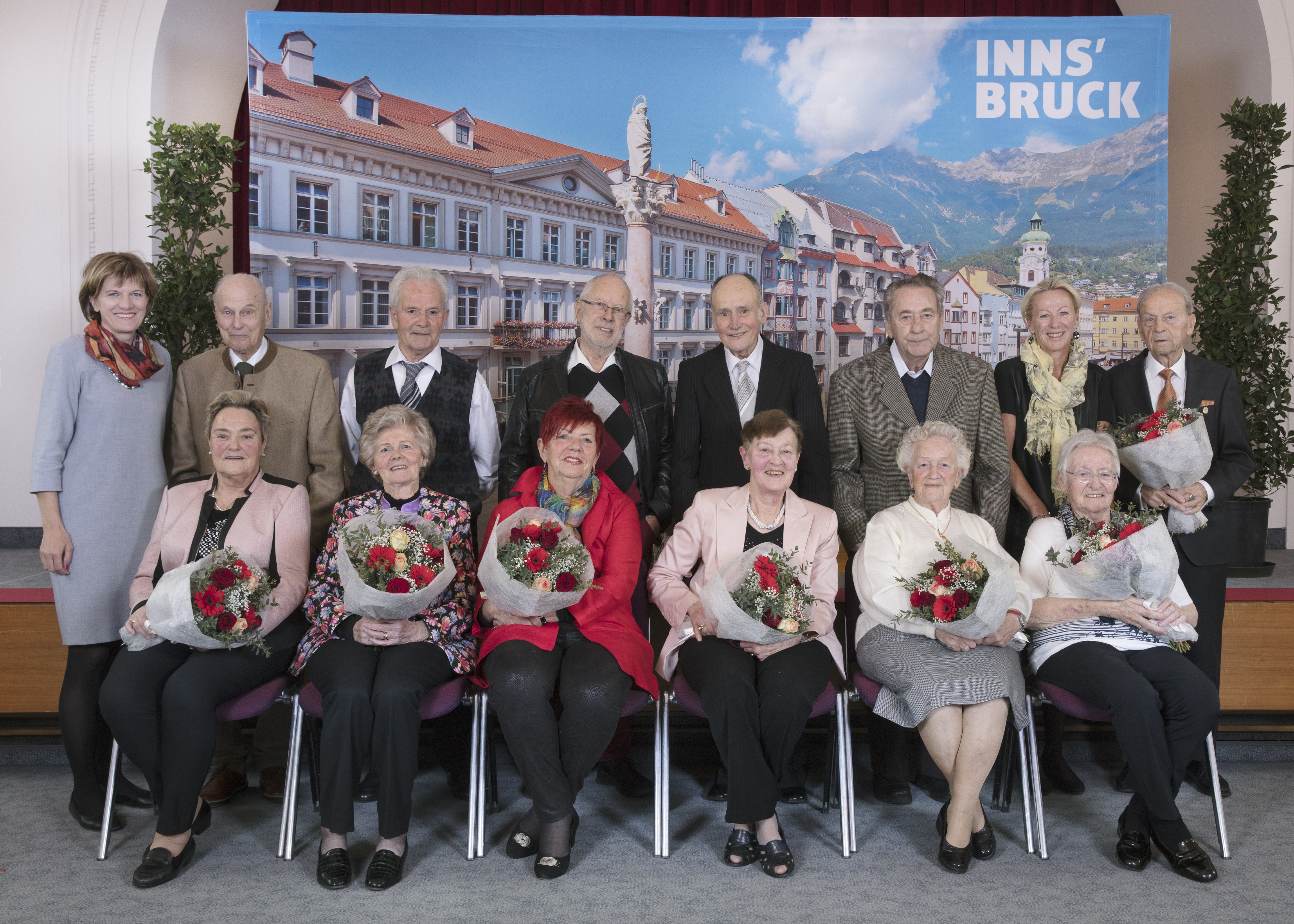 Ein Diamantenes bzw. Goldenes Hochzeitjubiläum ist bewundernswert und deshalb gebührend zu feiern: Insgesamt 23 Jubelpaare kamen am 14. März in die Ursulinensäle, um gemeinsam – auf Einladung der Stadt Innsbruck – ihre Hochzeitsjubiläen zu feiern. Bürgermeisterin Mag.ª Christine Oppitz-Plörer gratulierte den Jubelpaaren zu ihren langjährigen Eheversprechen und überreichte ihnen die Jubiläumsgabe des Landes Tirol sowie einen Blumenstrauß.
