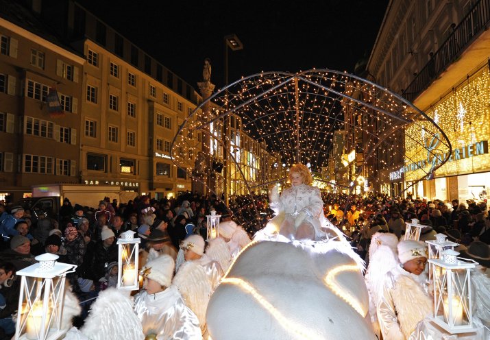 Um 17 Uhr setzt sich dann der feierliche Zug in Bewegung. Von der Triumphpforte führt der Weg über Maria-Theresien-Straße, Marktgraben, Herzog-Otto-Straße und Herrengasse bis zum Platz vor dem Tiroler Landestheater und bietet so reichlich Gelegenheit, den gesamten Zug zu bestaunen. Die Hirten und Engel mit ihren Laternen bringen einen warmen Lichterglanz in die Innenstadt und bereiten den Weg für das Christkind in seinem strahlenden, prunkvollen Wagen. An zwei Stationen (Rathaus, ca. 17.20 Uhr, und Marktplatz, ca. 17.40 Uhr) werden die traditionellen Lieder „Jetzt fangen wir zum Singen an“, „Kommet ihr Hirten“ und „Es wird scho glei dumpa“ gesungen, die sich als vorweihnachtliche Klangwolke über die Innsbrucker Innenstadt legen.