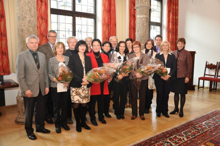 Die Ausgezeichneten erhielten in Anwesenheit von Bürgermeisterin Mag.a Christine Oppitz-Plörer, Amtsdirektor des Bezirksschulrates Innsbruck-Stadt und Personalamtsleiter Mag. Ferdinand Neu, Amtsleiterin Dr. Karin Zangerl (Familie, Bildung und Gesellschaft), Bezirksschulinspektor Ferdinand Treml sowie Mag. Christian Biendl, MSc. (Referent für Bezirksschulangelegenheiten) eine Urkunde und ein Geschenk.