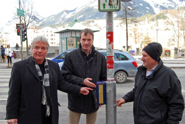 (RMS) Zu kurze Schaltintervalle bei Fußgängerampeln sind besonders für ältere bzw. gehbehinderte Menschen sowie für Schulkinder ein Problem, dem die Stadt Innsbruck nun entgegenwirkt. Verkehrsstadtrat Ernst Pechlaner stellte am 20. Dezember gemeinsam mit Amtsvorstand DI Dr. Reinhard Fischer und DI Michael Kaufmann vom städtischen Amt für Verkehrsplanung und Umwelt die neuen Verkehrslichtsignalanlagen vor, die es FußgängerInnen erlauben, bei Bedarf selbstständig eine längere Freigabezeit zu schalten.