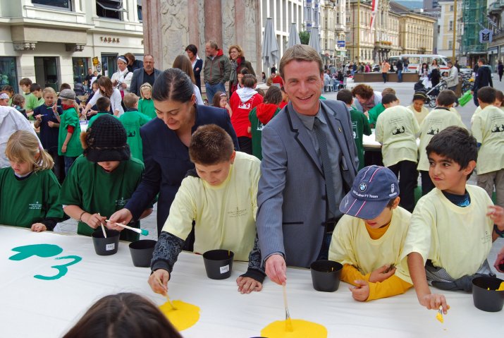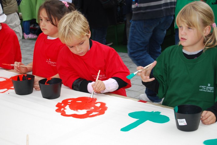 (RMS) Buntes Treiben vor dem Rathaus: Rund 100 Kinder aus den Innsbrucker Schülerhorten versammelten sich in der Maria-Theresien-Straße, um Stoffbahnen mit bunten Blumen zu bemalen. Diese werden in Folge vom Balkon des Rathauses wehen und damit die Fußgängerzone verzieren. Vizebürgermeister Christoph Kaufmann und Stadträtin Dr. Patrizia Moser begrüßten die Kinder und ihre BetreuerInnen bei angenehmem Herbstwetter.