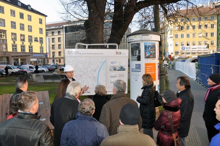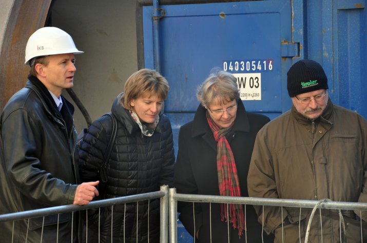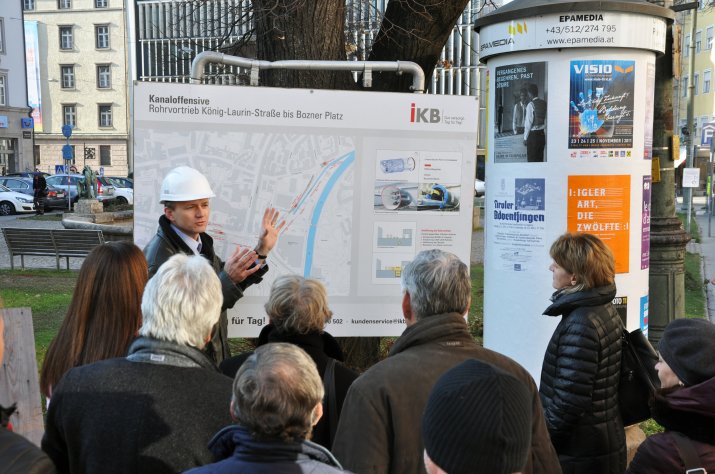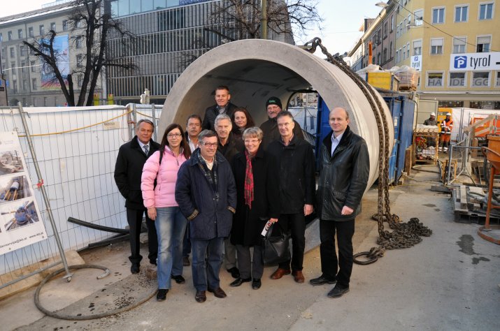 Der unterirdische Kanalvortrieb, der seit Jänner 2011 im Zuge der Kanaloffensive 2020 der Innsbrucker Kommunalbetriebe AG realisiert wird, ist mittlerweile am Bozner Platz angelangt. Um sich von den Bauarbeiten tief unter der Oberfläche selbst ein Bild zu machen, besichtigte Bürgermeisterin Mag.a Christine Oppitz-Plörer mit zahlreichen Mitgliedern des Innsbrucker Gemeinderates am 24. November die Baustelle am Bozner Platz.