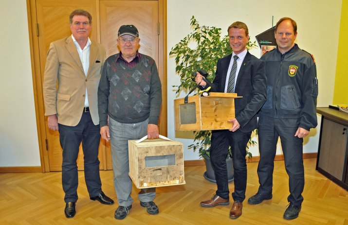 Ein Bienenschwarm ist ein beeindruckendes Schauspiel der Natur: Tausende Bienen bedecken den Himmel und sammeln sich mit ihrer Königin auf Ästen, Mauervorsprüngen, aber gerade in der Stadt auch häufig an ungünstigen Stellen. Am 13. Mai trafen sich Ing. Reinhard Hetzenauer (Präsident Landesverband für Bienenzucht in Tirol), Imker August Ackerl, Branddirektor Mag. Erwin Reichel und Feuerwehrreferent Vizebürgermeister Christoph Kaufmann im Rathaus, um über das richtige Verhalten mit Bienenschwärmen zu informieren.
