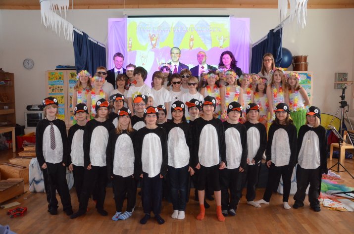 Mit Musik, Gesang, tollen Kostümen und einem bunten Bühnenbild erzählten die VolksschülerInnen von Tim Pinguin, der sich in seiner Heimat, dem Südpol, nicht wohlfühlt. Aus diesem Grund macht er sich auf die weite Reise nach Hawaii, wo er Wärme, Freude und Farben findet, mit denen er schließlich wieder in seine Heimat zurückkehrt.