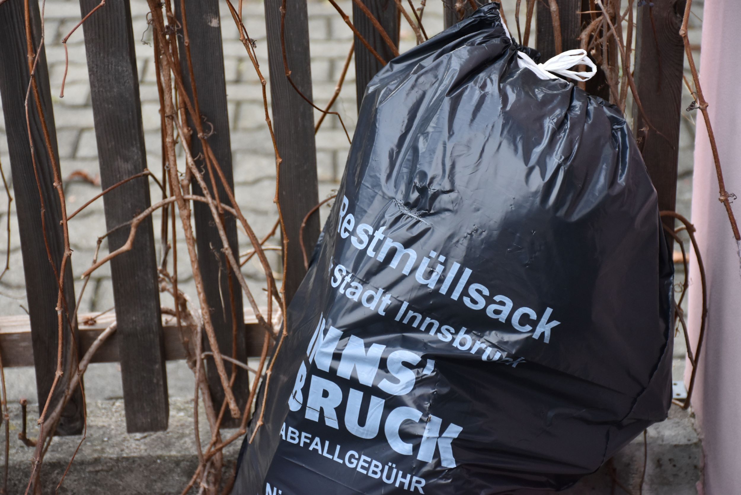 Apropos Abholung: nur schwarze Säcke mit dem Innsbruck-Logo werden von der Müllabfuhr der Innsbrucker Kommunalbetriebe AG (IKB) eingesammelt. Weitere Informationen: www.innsbruck.gv.at → Bauen│Wohnen → Steuern│Abgaben → Abfall│Müllgebühr.