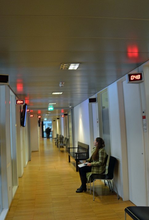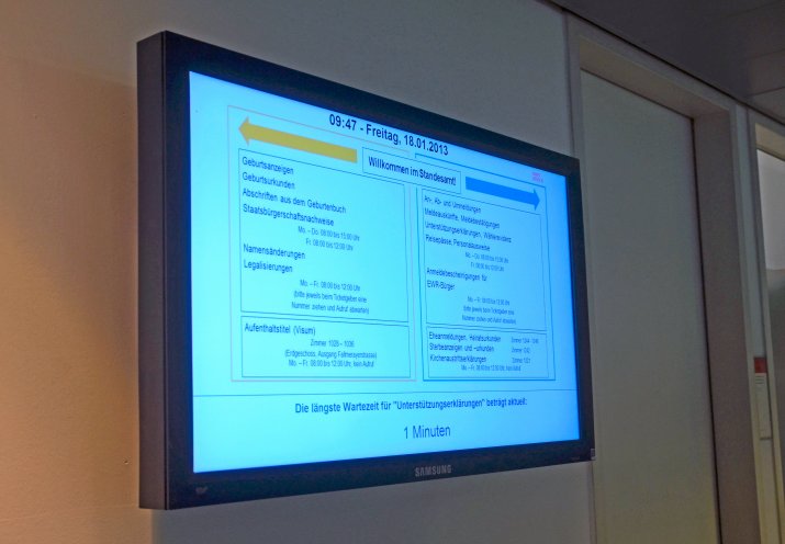 Im Sinne einer bürgerfreundlichen Stadt wartet das Pass- und Meldewesen des Magistrats mit einer neuen, modernen Aufrufanlage auf: Ein 40“ Monitor am Stiegenaufgang fungiert als Wegweiser im Eingangsbereich und informiert über die aktuellen Wartezeiten. Im Wartebereich wurden zwei zimmerweisenden 32“ Monitore angebracht. Bei den aufrufenden Schaltern wurden zwölf signalgebende Anzeigen installiert.