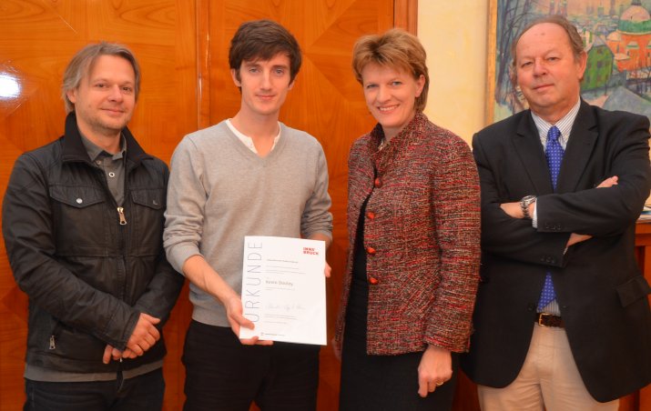 Dieses Jahr geht das von der Stadt Innsbruck geförderte Stipendium für das Künstlerhaus Büchsenhausen an Kevin Dooley. Am 13. November überreichten Bürgermeisterin Mag.a Christine Oppitz-Plörer, Kulturamtsleiter Horst Burmann und der Leiter des Künstlerhauses Büchsenhausen Andrei Siclodi die Förderung an den jungen Künstler. „Ich bin mir sicher, dass das Geld bei Ihnen gut angelegt ist“, beglückwünschte Bürgermeisterin Oppitz-Plörer den Stipendiaten: „Meine herzliche Gratulation dazu!“