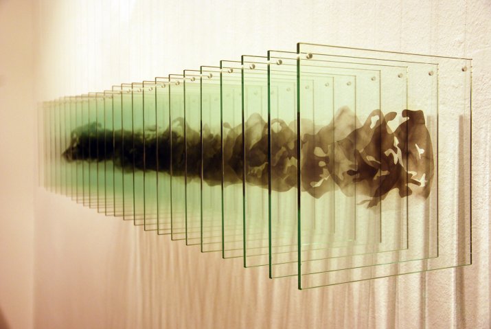 Bei „Fumagen“ wird Ruß auf Glas aufgebracht und anschließend zu Verbundsicherheitsglas verarbeitet. Um den mehrschichtigen Rußauftrag zu beeinflussen, arbeitet Pflug mit Schablonenfolie. Durch diese Arbeitsweise lassen sich unterschiedliche Materiendichten und Strukturierungen mit einer Präzision darstellen, wie man sie von der Magnetresonanz oder der Computertomografie kennt.