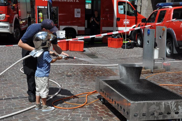 (RMS) Einmal selber Feuerwehrmann sein und Feuer löschen, einen Blick ins Rettungsauto werfen, sich von Polizisten Tipps holen oder von der Bergrettung gesichert einen Kletterturm erklimmen: Das „Peterle hilft“-Sicherheitsfest rund um den Stadtturm am 29. Juni war Anziehungspunkt für zahlreiche Kinder.