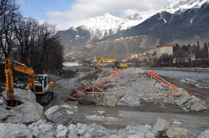 Im Rahmen des Hochwasserschutzprojektes an Sill und Inn kommen die Arbeiten im Bauabschnitt 3 plangemäß voran. Aktuell stehen die Arbeiten am Altarm der Sill im Vordergrund, die im April 2011 abgeschlossen sein werden.