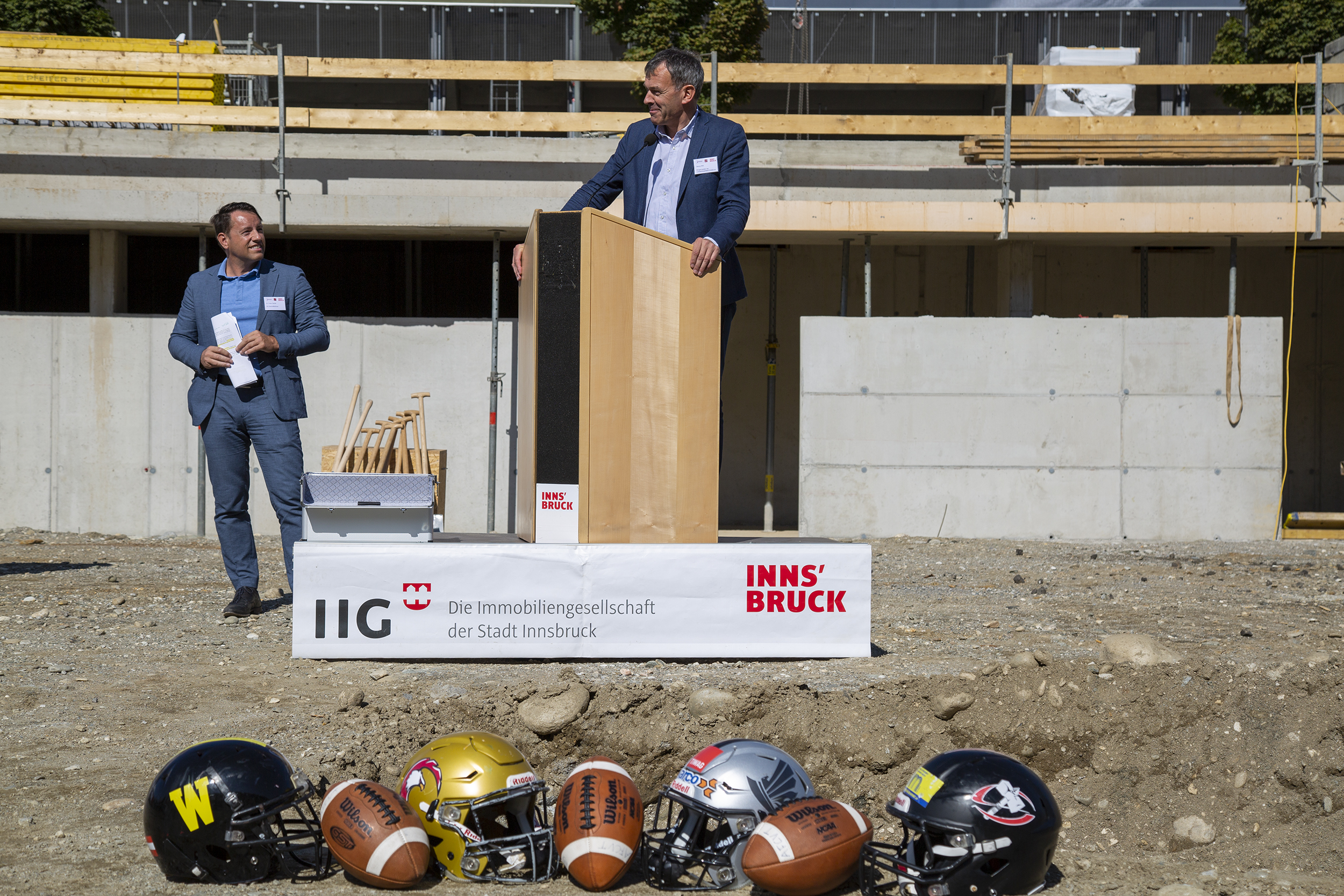Dr. Franz Danler, Geschäftsführer der Innsbrucker Immobilien Gesellschaft (IIG), erläutert: „Neben Funktionalität, multifunktionaler Bauweise und Nachhaltigkeit war die Berücksichtigung der Tribünen bzw. die gute Erreichbarkeit für Fans ein wesentliches Kriterium. Die IIG ist sowohl im Wohnbau- als auch im Kultur- und Sportinfrastrukturbereich ein verlässlicher Partner. Nach zahlreichen Großprojekten, wie das Sillside mit Kletter- und Skatehalle, stellen wir uns gerne auch der Herausforderung für das neue American Football Zentrum.“