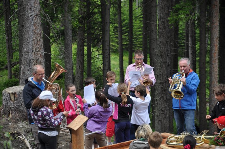 Musikalisch umrahmt wurden die Feierlichkeiten von der Bläsergruppe der Volksschule Amras und dem Chor der vierten Klasse gemeinsam mit Direktor Christian Bramböck und Personalamtsleiter Mag. Ferdinand Neu. Sogar eine „Quellenpolka“, die eigens für die Einweihung komponiert wurde, fand ihre Uraufführung: