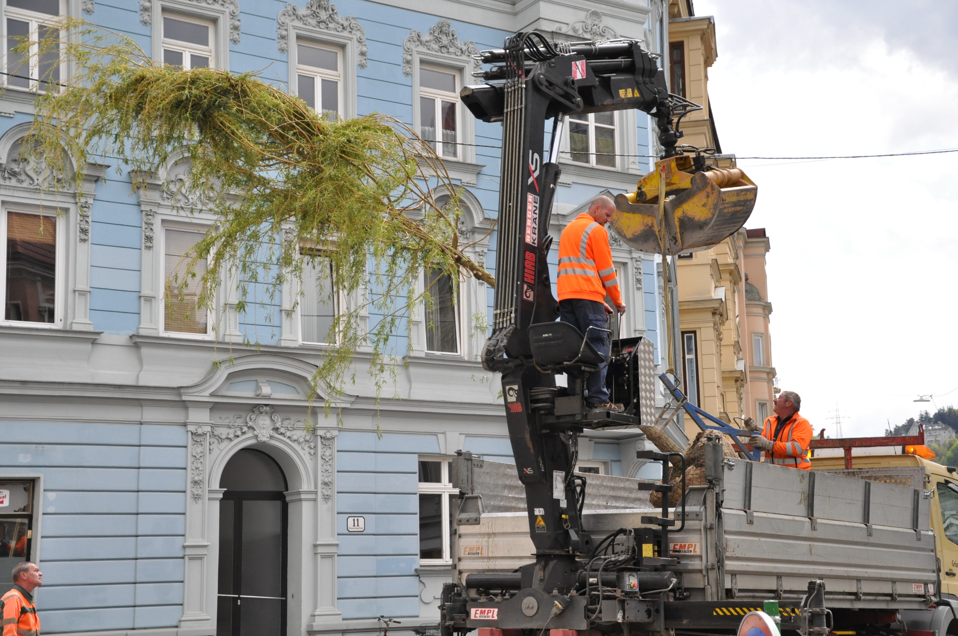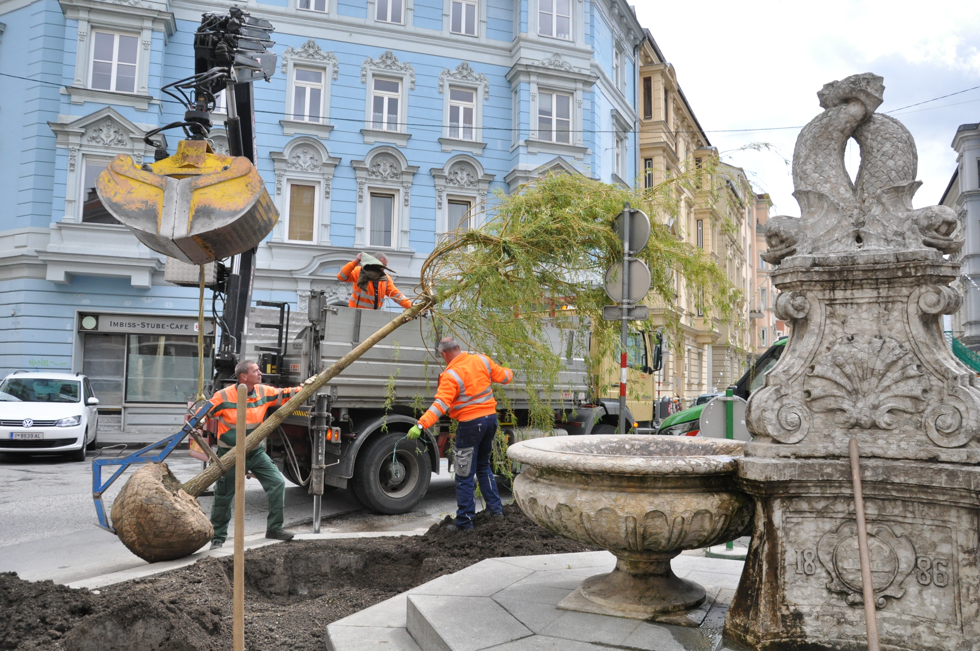 Mit einem Stammumfang von knapp 35 Zentimetern und einer Höhe von sechs Metern steht in der Sonnenburgstraße im Innsbrucker Stadtteil Wilten nun eine neue Trauerweide. Die Mitarbeiter des Amtes für Grünanlagen pflanzten heute den neuen Baum am Kreisverkehr in Wilten ein. Das Team des Amtes für Straßenbetrieb reparierte zuvor noch die Steineinfassung des Platzes.