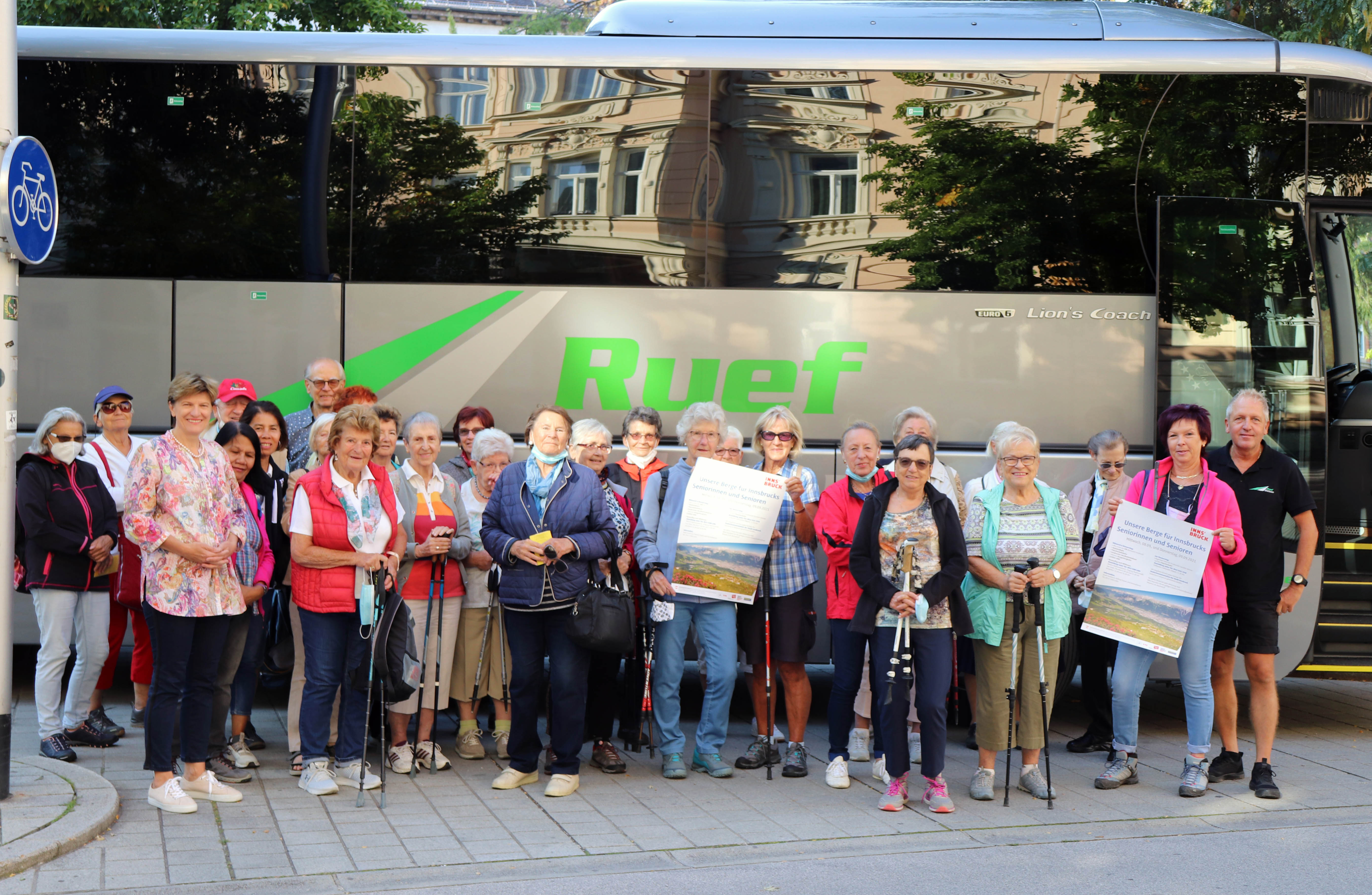 Mit herrlichen Wetteraussichten verabschiedete SeniorInnenstadträtin Mag.a Christine Oppitz-Plörer am 8. September die erste Gruppe des Busausfluges nach Wildmoos, der im Rahmen der Aktion „Unsere Berge für Innsbrucks Seniorinnen und Senioren“ insgesamt vier Mal vom Referat Frauen und Generationen organisiert und begleitet wird.