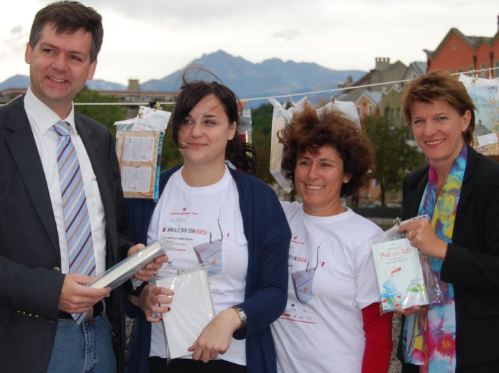 (RMS) Lesen macht Spaß, das wissen jene Menschen, die beim sinnerfassenden Lesen keine Schwierigkeiten haben. Anlässlich des Weltalphabetisierungstages am 8. und 9. September schickt die Volkshochschule Tirol (VHS) am Weg von der Innsbrucker Innbrücke über den Marktgraben bis zur Zentrale der VHS in der Ursulinenpassage über 1000 Bücher auf die Reise und will gleichzeitig auf das Problem der Grundbildung in Tirol aufmerksam machen. Innsbrucks Bürgermeisterin Mag.a Christine Oppitz-Plörer war in ihrer Funktion als Vorsitzende der VHS Tirol gemeinsam mit dem Geschäftsführer der VHS, Mag. Ronald Zecha, beim Start der Aktion dabei.