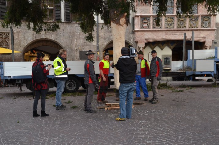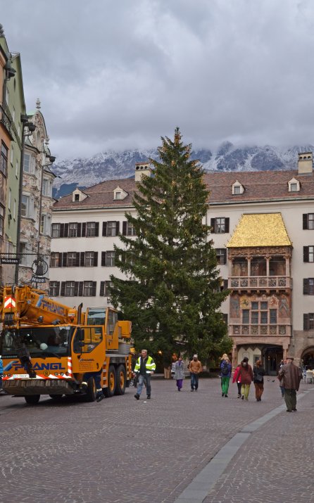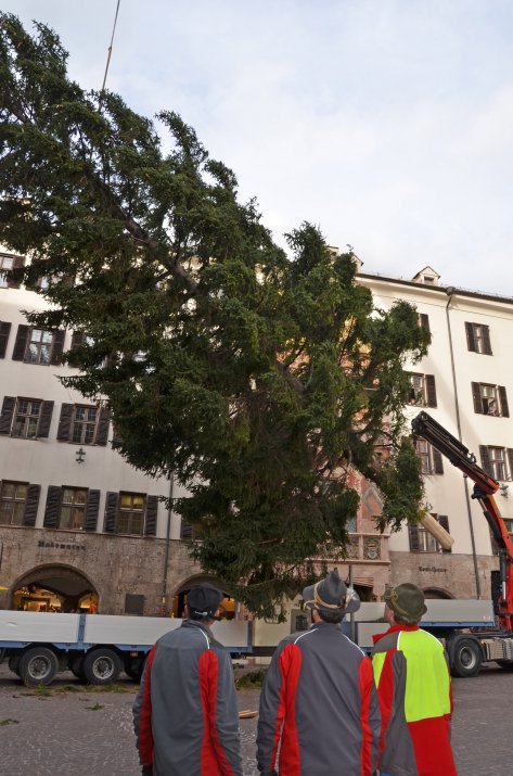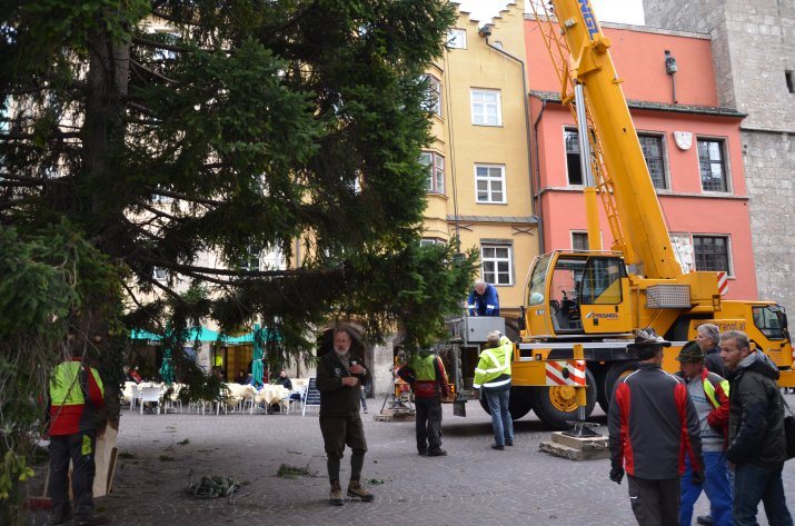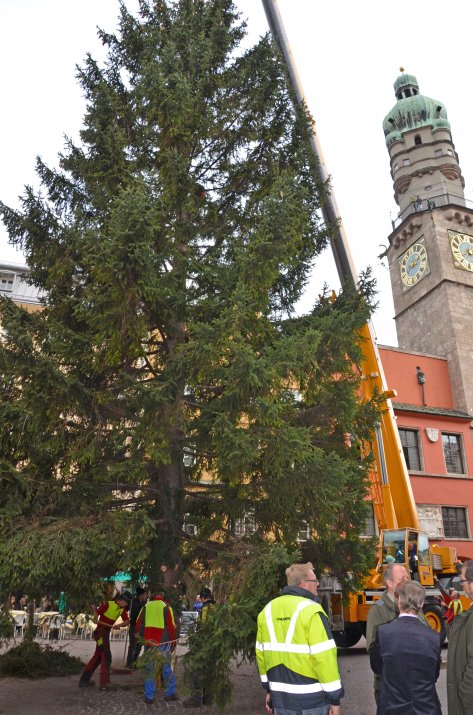 Jetzt steht sie vor der Tür, die besinnlichste Zeit des Jahres. Aus diesem Anlass wurde am 4. November eine 50 Jahre alte, 21 Meter hohe und 5,2 Tonnen schwere heimische Fichte aus einem Privatgarten am Mitterweg vom Amt für Land- und Forstwirtschaft am Vorplatz des Goldenen Dachls aufgestellt. Auch heuer ist der Baum wieder sichtbarer Mittelpunkt des Christkindlmarktes.