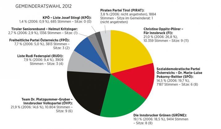 Die Tiroler Landeshauptstadt Innsbruck hat am 15. April den Gemeinderat und erstmals auch direkt das Stadtoberhaupt gewählt. Inklusive der Wahlkarten lag die Wahlbeteiligung bei 52,33%. Nun liegt das offizielle Endergebnis vor.