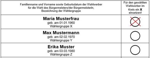Der amtliche Stimmzettel für die Wahl des Bürgermeisters ist gültig ausgefüllt, wenn aus ihm eindeutig zu erkennen ist, welche/n WahlwerberIn der/die WählerIn wählen wollte. Dies ist insbesondere dann der Fall, wenn in einem der rechts neben den Namen der WahlwerberInnen vorgedruckten Kreis ein Kreuz oder ein anderes Zeichen angebracht wird, aus dem eindeutig hervorgeht, dass der bzw. die in derselben Zeile angeführte Wahlwerber bzw. Wahlwerberin gewählt werden wollte.