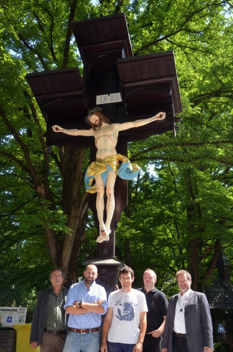 Am Innsbrucker Westfriedhof befinden sich an den Schnittpunkten der Hauptwege zwei Kreuze mit Christusfiguren. Das ältere, im Nordteil des Friedhofes befindliche, wurde bereits im vergangenen Jahr einer umfangreichen Restaurierung unterzogen. Nun folgte in mehrwöchiger Arbeit auch das Kreuz im jüngeren südlichen Teil des Westfriedhofes. Grünanlagenreferent Stadtrat Mag. Gerhard Fritz besichtigte am 27. Juni gemeinsam mit Mag. Alexander Legniti (Referat Friedhöfe) das rundum erneuerte Kunstwerk.
