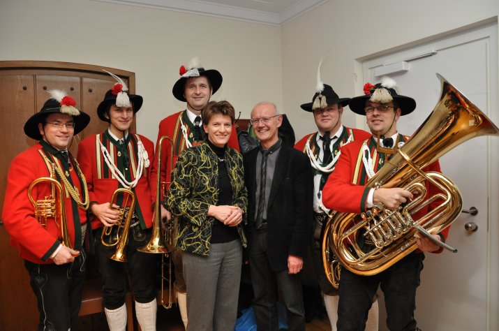Weihnachtsbläser der Stadtmusikkapelle Wilten waren gekommen, um das Stadtoberhaupt mit Trompetenklängen zu erfreuen. Spontan entführte Oppitz-Plörer die fünf Musikanten mit Obmann Roland Tanzer in die Bauabteilung der Stadt, wo die MitarbeiterInnen der Magistratsabteilung III gerade zu einer Weihnachtsfeier zusammen gekommen waren. So konnten auch sie sich an der „Bläserweis“, „Es wird schon glei dumpa" und am„Andachtsjodler“ erfreuen.