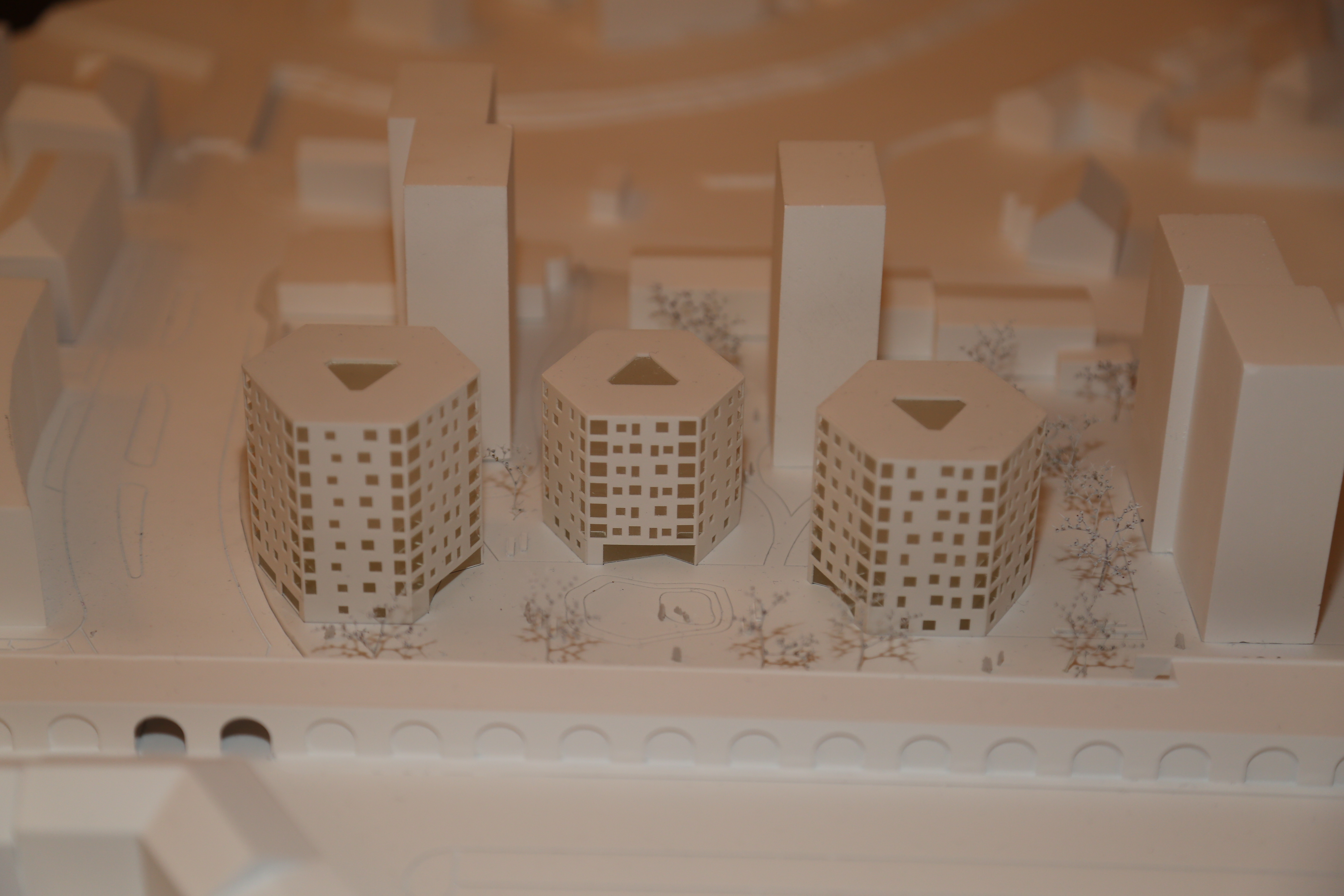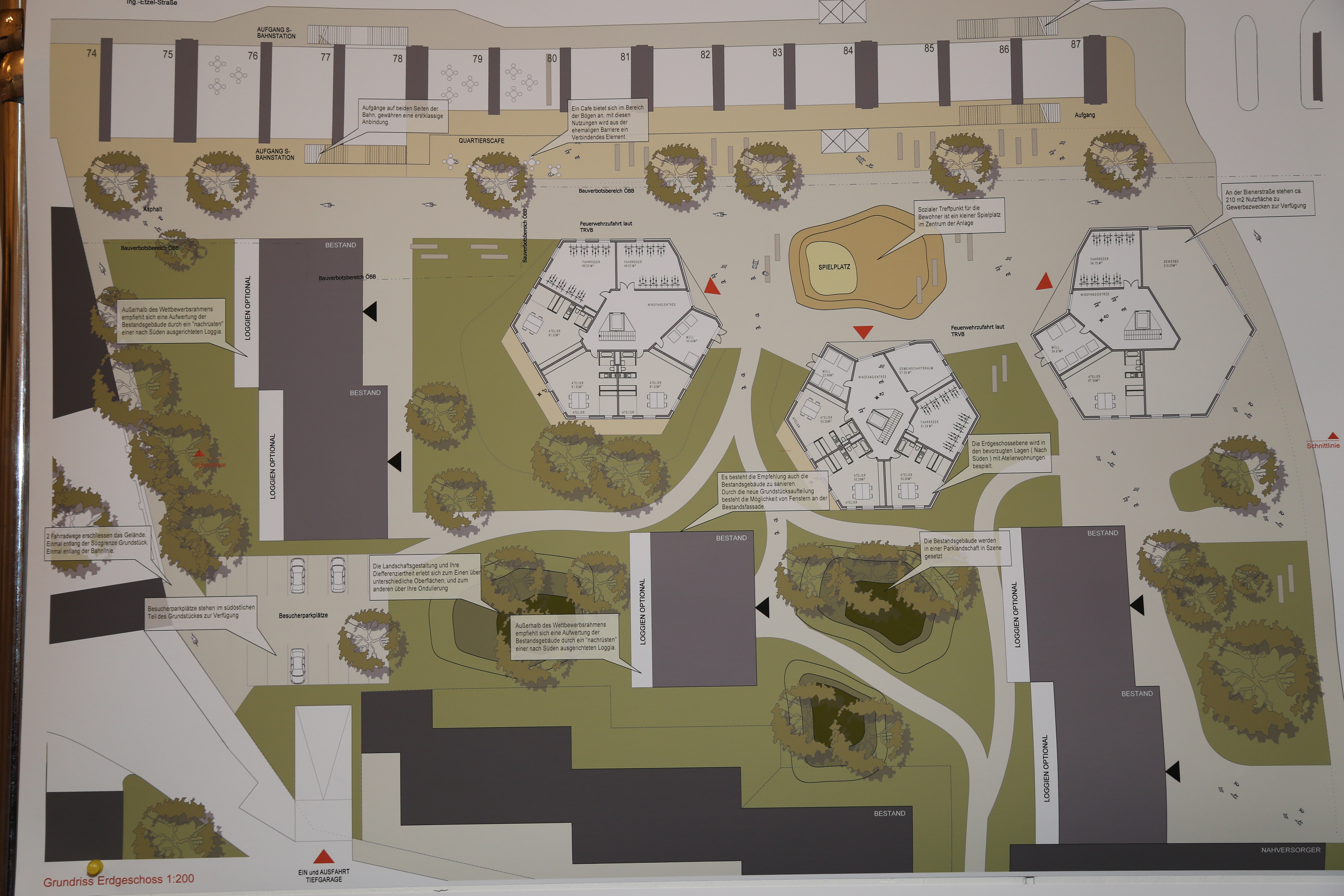 Die Jury lobt insbesondere die „andersartige Vollendung“ des Bauprojektes als unverwechselbar und identitätsstiftend für den Bauplatz. Dem Projekt liegt die Idee höchster Kompaktheit zugrunde: Durch neue, radial angelegte Grundrisstypologien wird Wohnraum geschaffen, der sich zum Licht hin öffnet. Dabei bietet jede Wohnung über Eck gelegenen Loggien und einer Belichtung von zwei Seiten. Auch in Hinblick auf die Freiraumgestaltung überzeugt das Siegerkonzept: Die Durchlässigkeit von Neubau und Bestand bleibt erhalten. Ein im Norden des Grundstücks geplanter Spielplatz und eine beruhigte Grünanlage im Süden bieten Spiel- und Erholungsraum gleichermaßen.