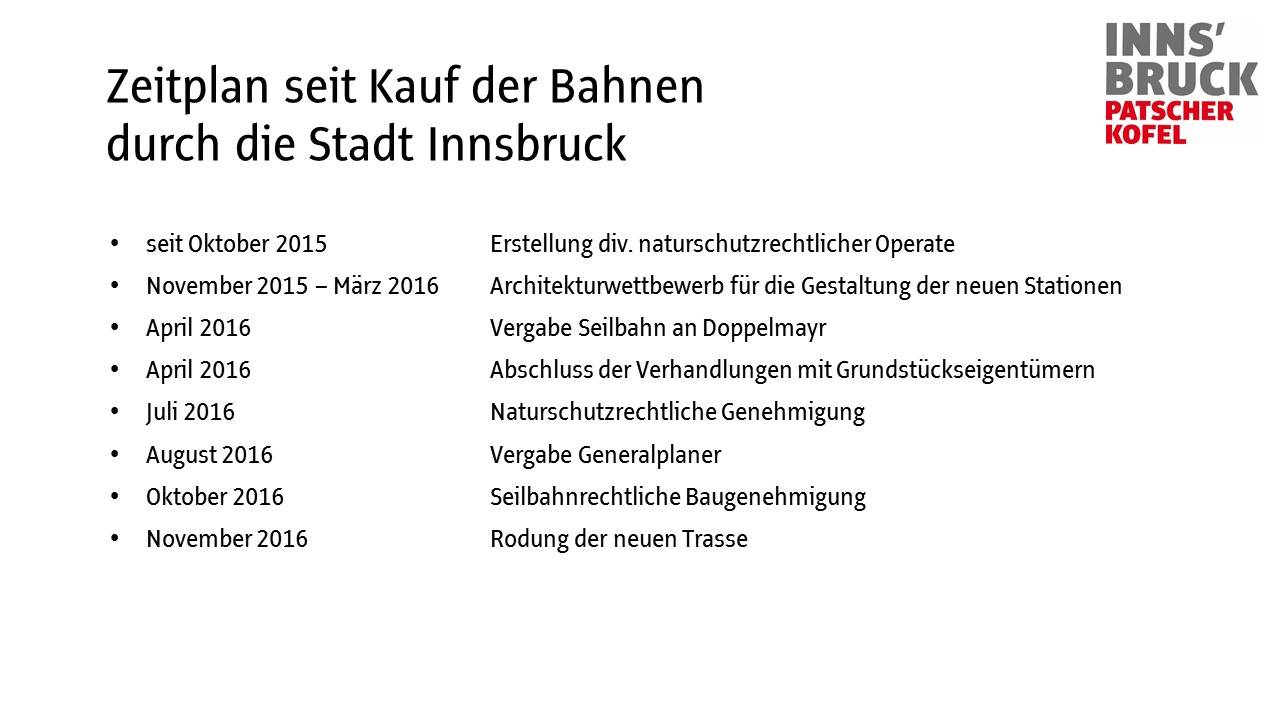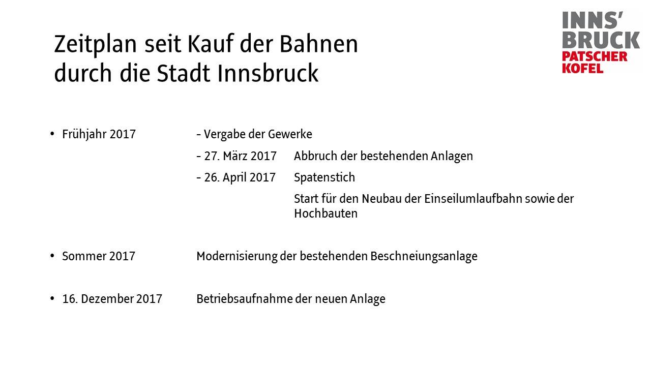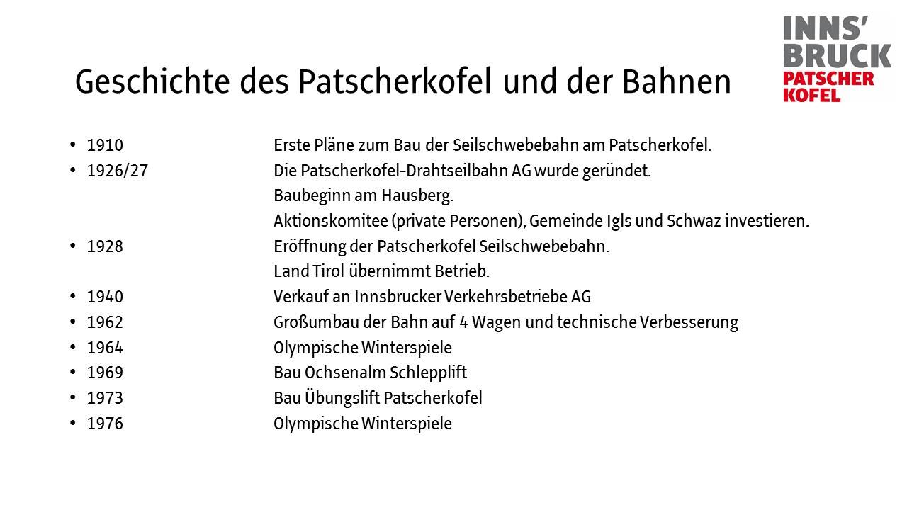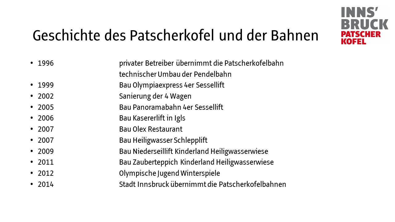 Die Stadt Innsbruck hat 1996 die Kofelbahn um 2,8 Millionen Schilling an Prof. Peter Schröcksnadel verkauft. Bedingung für den Verkauf war damals eine 20-jährige Betriebs- sowie eine Investitionspflicht. Diskussionen über die Ausrichtung des Hausberges folgten 2012, die weitere Zukunft war ungewiss. Im Wissen, dass der Vertrag 2016 endet, verbunden mit einer anstehenden Investitionsvorgabe seitens der Seilbahnbehörde und im Wissen, dass die Konzession für die Bahn im Jahr 2022 generell ausläuft, hat der Gemeinderat 2014 mit 97 Prozent Mehrheit beschlossen, alle Anlagen am Patscherkofel um 10,7 Millionen Euro zurückzukaufen (Preisvorstellung des Verkäufers bis zu 16,3 Millionen Euro). Damit wurde Gestaltungsspielraum erzielt.