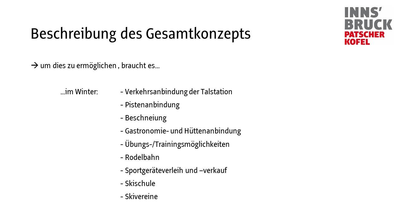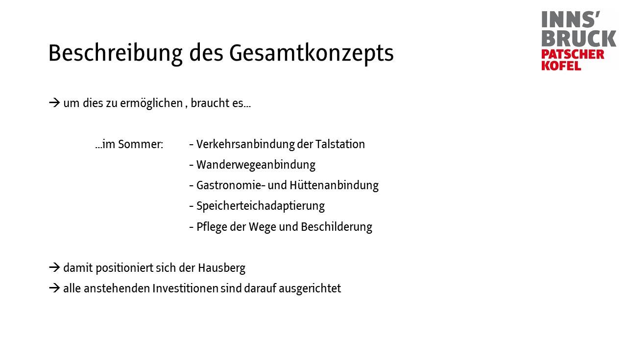 Ziel ist ein kleines, feines Skigebiet mit reduziertem Anlagenpark. Die neue Bergstation ist nicht aus Jux und Tollerei dort situiert und keine politische Entscheidung. Sie ist in Zusammenschau von Landschaftsschutzgebiet, Lawinen- und Windschutz, Erreichbarkeit von Schutzhaus und Pisten sowie des Wanderweges von vielen ExpertInnen als optimaler Standort geplant worden. Jede andere Position der Bergstation würde ungemein größere Eingriffe – wie Lawinenschutzbauten im Schutzgebiet – erfordern. Der Gipfellift wurde vor fünf Jahren vom Voreigentümer abgebaut. Eine zusätzliche Neuerschließung ist aus Naturschutz- und Windgründen nicht sinnvoll möglich.