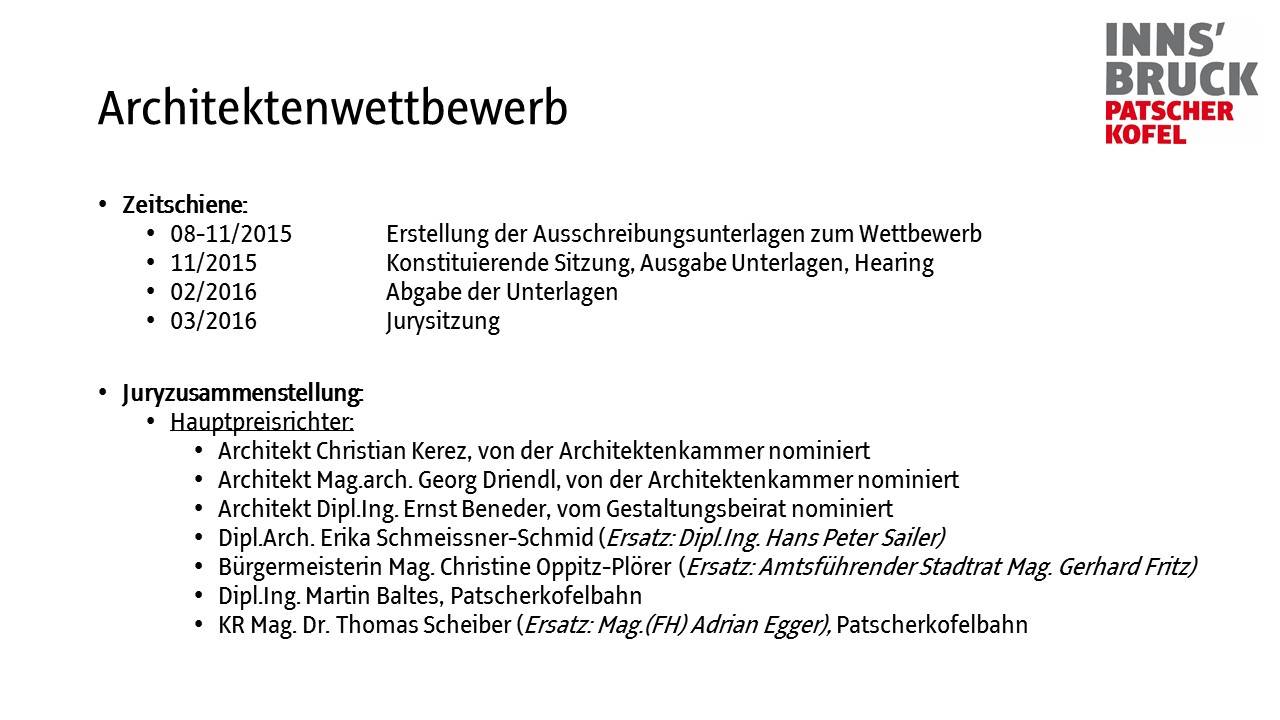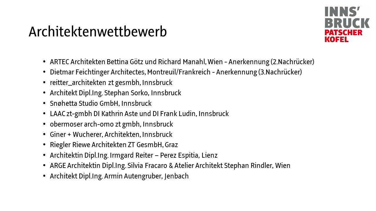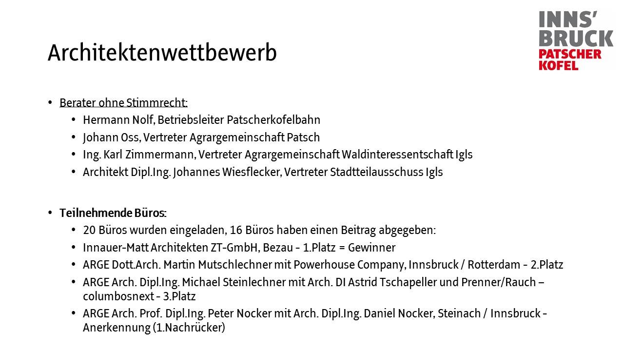 Innsbruck zeichnet sich im Tal und in der Höhe seit Jahren durch qualitätsvolle Architektur aus. Hungerburgbahn und Umbrüggler Alm sind alpin-urbane Highlights, die anfänglich massiv in der öffentlichen ritik standen. Die Stadt muss zudem im Sinne einer Gleichbehandlung jenen Qualitätsanspruch, den sie von Privaten verlangt, selbst leisten.