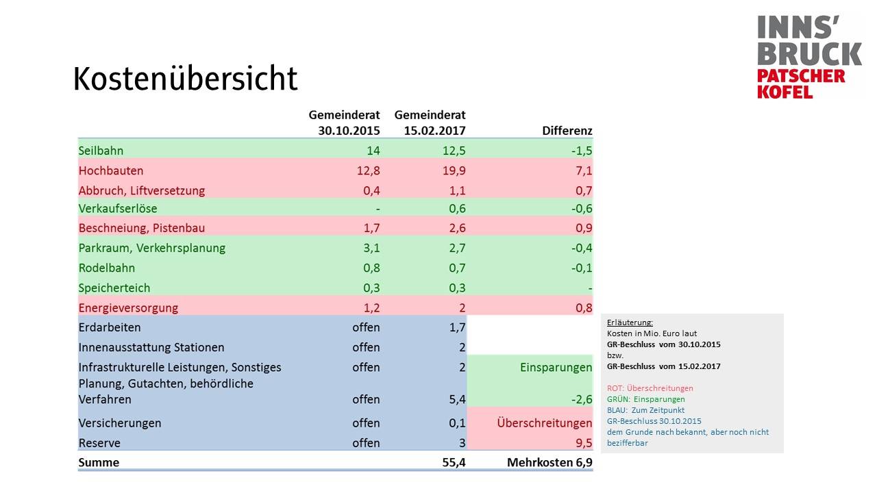 Die Seilbahn selbst kostet rund 12,5 Millionen Euro. Die Projektkosten belaufen sich nach aktuellen Berechnungen auf rund 55 Mio. Euro. Davon entfallen knapp 22 Millionen Euro auf die drei Hochbauten und die Abtragungsarbeiten der ehemaligen Anlagen. Der Verkauf von Panoramabahn und Olex bringt rund 560.000 Euro an Einnahmen. Der Pistenbau sowie die technische Verbesserung der Beschneiungsanlage schlagen mit knapp 2,5 Millionen Euro zu Buche, die Verkehrsplanung mit dem Parkraumkonzept ist ebenfalls in dieser Größenordnung veranschlagt. Günstiger als ursprünglich kalkuliert sind die Maßnahmen für die Rodelbahn und den Speicherteich, die zusammen rund 1 Million Euro betragen. Weitere Punkte wie die Energieversorgung, die Erdarbeiten, die Innenausstattung der Stationen, Planungs- sowie Infrastrukturleistungen und Versicherungen machen rund 13 Millionen Euro aus. Zusätzlich ist eine Reserve in Höhe von 3 Millionen Euro einkalkuliert. Große nachhaltige Infrastrukturprojekte erfahren einen hohen Investitionsgrad. Auch Großprojekte wie das Architekturdenkmal Sprungschanze (Investitionsvolumen alleine der Stadt Innsbruck umgerechnet auf das Jahr 2017 rund 23 Millionen Euro) oder die von den InnsbruckerInnen geschätzte Hungerburg- und Nordkettenbahn (Investitionsvolumen umgerechnet auf das Jahr 2017 rund 51 Millionen Euro) haben nachhaltigen Mehrwert für die Bevölkerung gebracht. Letztere stand speziell stark in der Kritik und ist nun sowohl aus dem Stadtbild als auch aus dem Stadtleben nicht mehr wegzudenken.